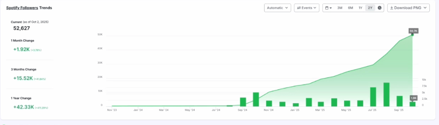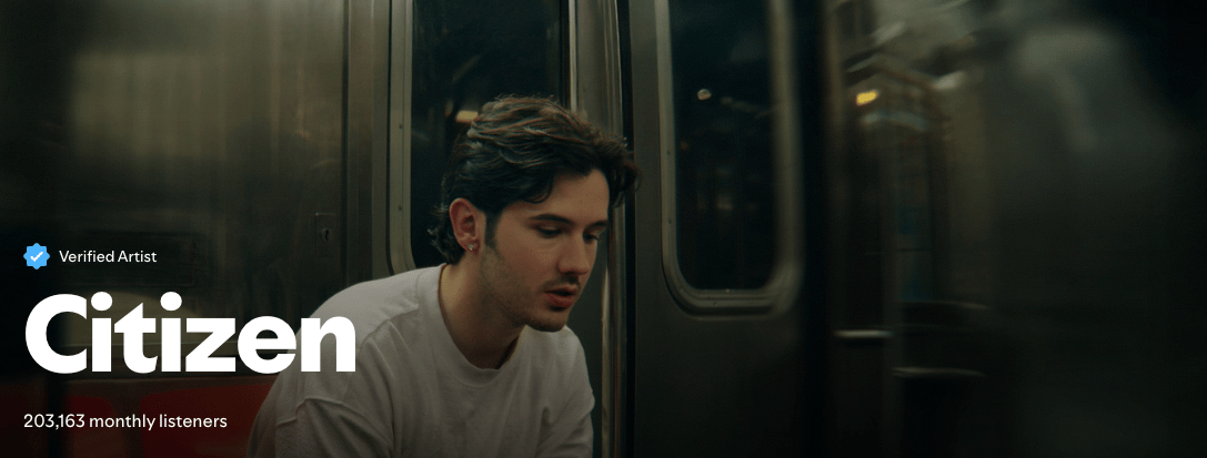 Citizen has 250,000 monthly listeners on Spotify. The first release dropped on July 1st, 2024, when they had about 3,000 monthly listeners. They peaked at 383,000 before settling at 250,000. There's a story in that decline.