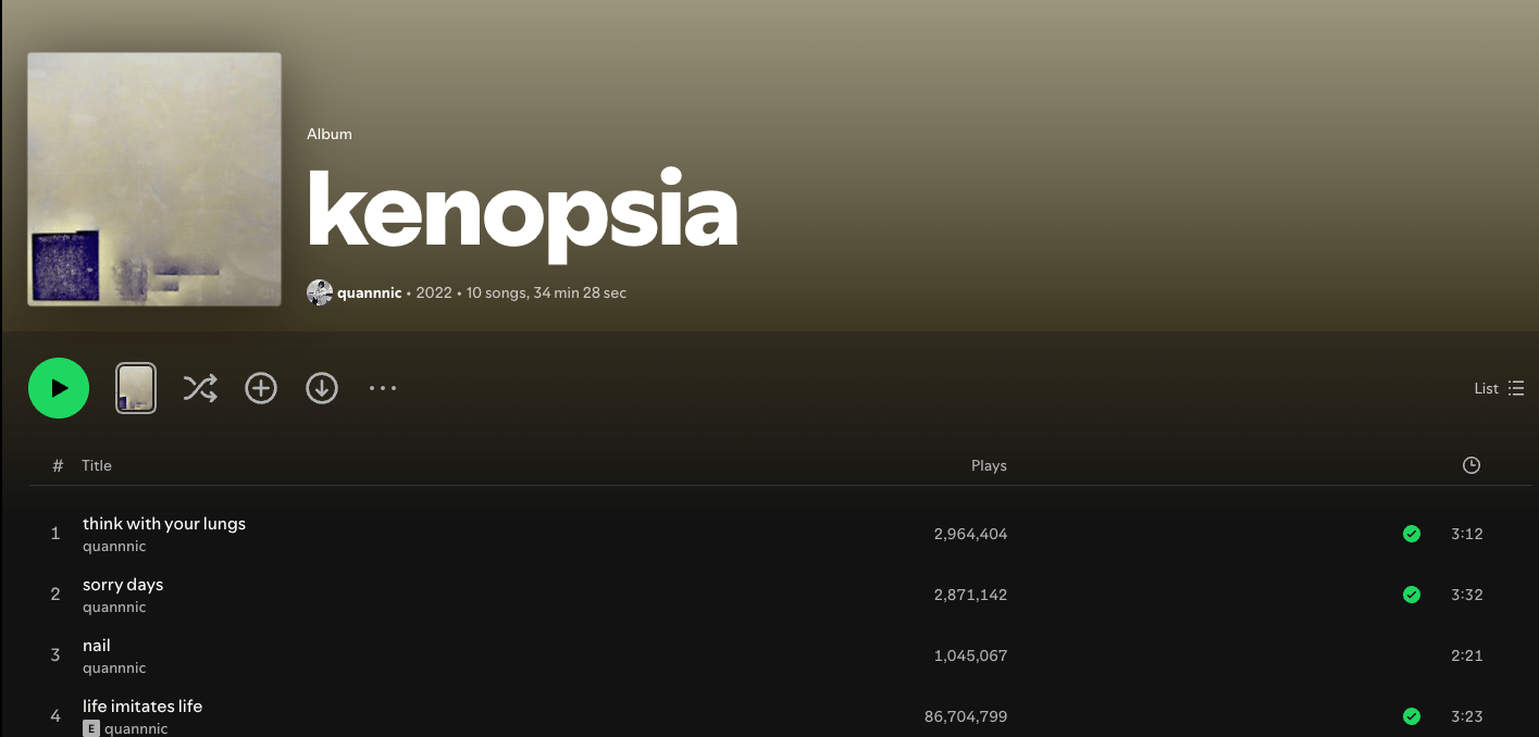 One of the most interesting things about Hudson's sound is he's clearly very influenced by modern-day shoegaze — specifically quannnic and their record Kenopsia. If you're not familiar with that record and you really like fucked-up lo-fi sound manipulations, it is chef's kiss. It's one of the records I've listened to the most in the last few years, definitely in my top 25. The way it fucks up the songs underneath it in a way that accentuates the emotion is really sick.