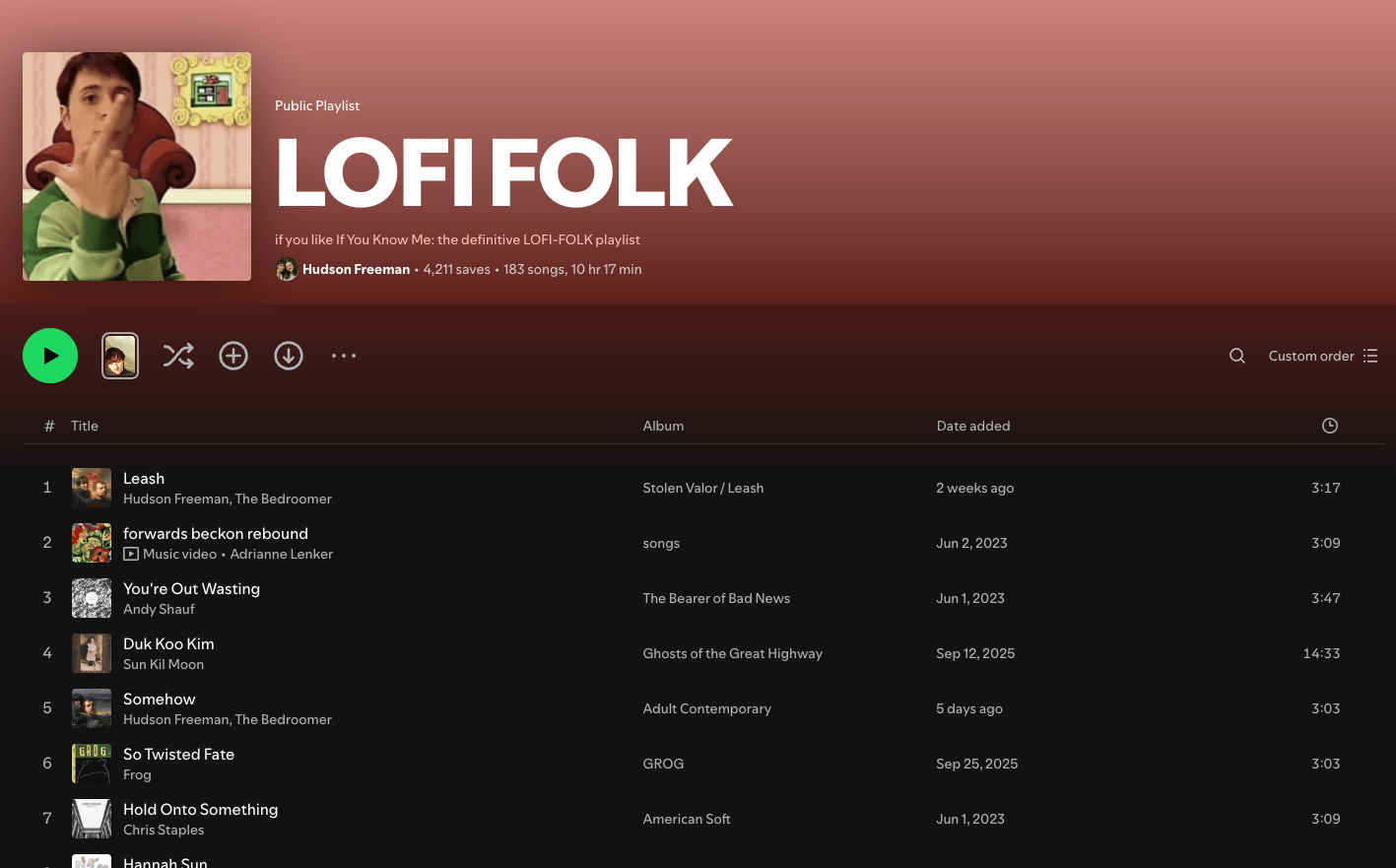 One of the smart things he's doing is running a lo-fi folk playlist. It starts with "If You Know Me" — the song that's been getting him a bunch of attention — and then has a whole bunch of songs in it to make algorithmic connections. Scroll down that playlist and sure enough, there's another Hudson Freeman song. Keep going — another one. And another. He's tying himself to other artists he should be quickly connected to algorithmically and pulling people deeper into this lo-fi folk world he's doing.