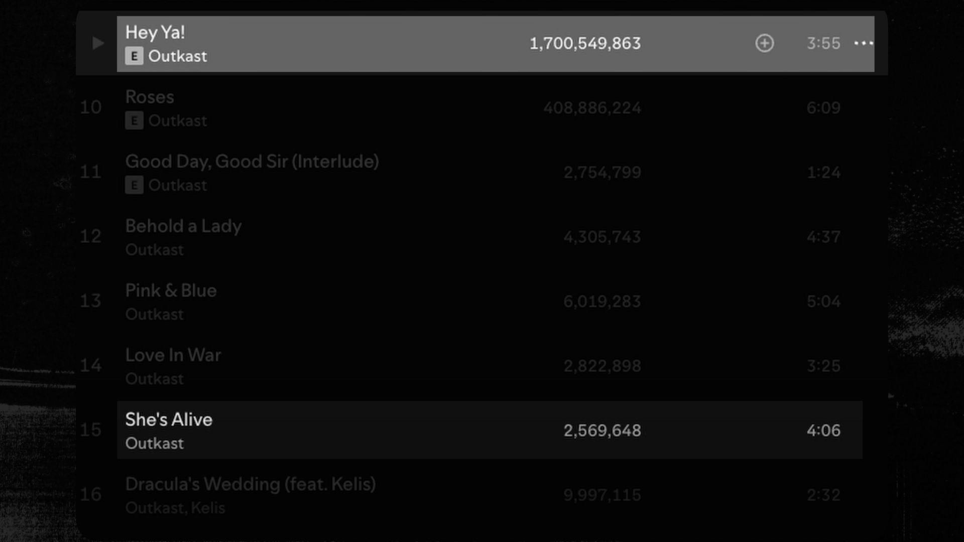 Let's do a really extreme example: take OutKast's classic album "Speakerboxxx." "Hey Ya" has 1.7 billion plays, but "She's Alive" only has 3 million plays. So if Big Boi and Andre were doing this, "Hey Ya" would be 567 times better in the test. That is statistically significant.