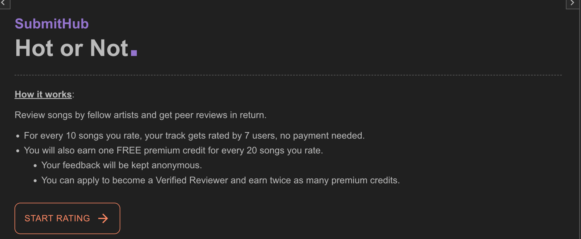 SubmitHub also has another part of its platform that will show you things where you can go to its Hot or Not feature. Inside Hot or Not, you can post your song, and people will comment on it and what they think it sounds like.