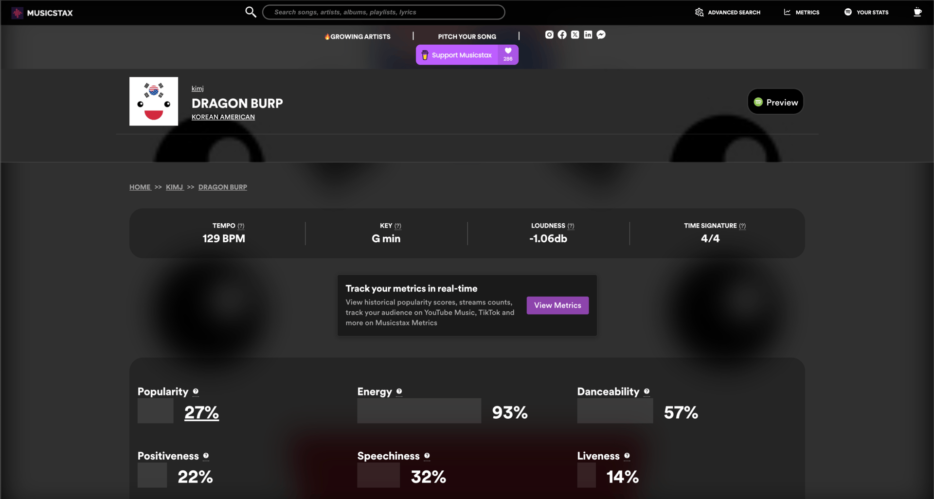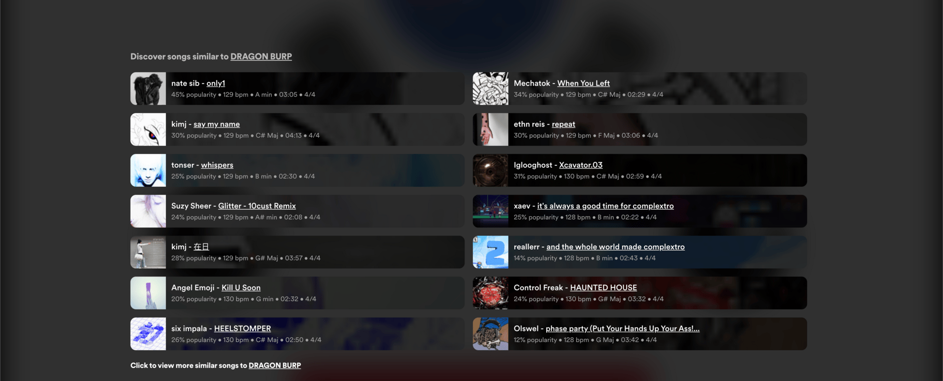 But what you can also see is if you click on any of their songs, and if you find you sound like a particular one of their songs, you can see a whole list at the bottom that the algorithm finds to be similar to these songs.