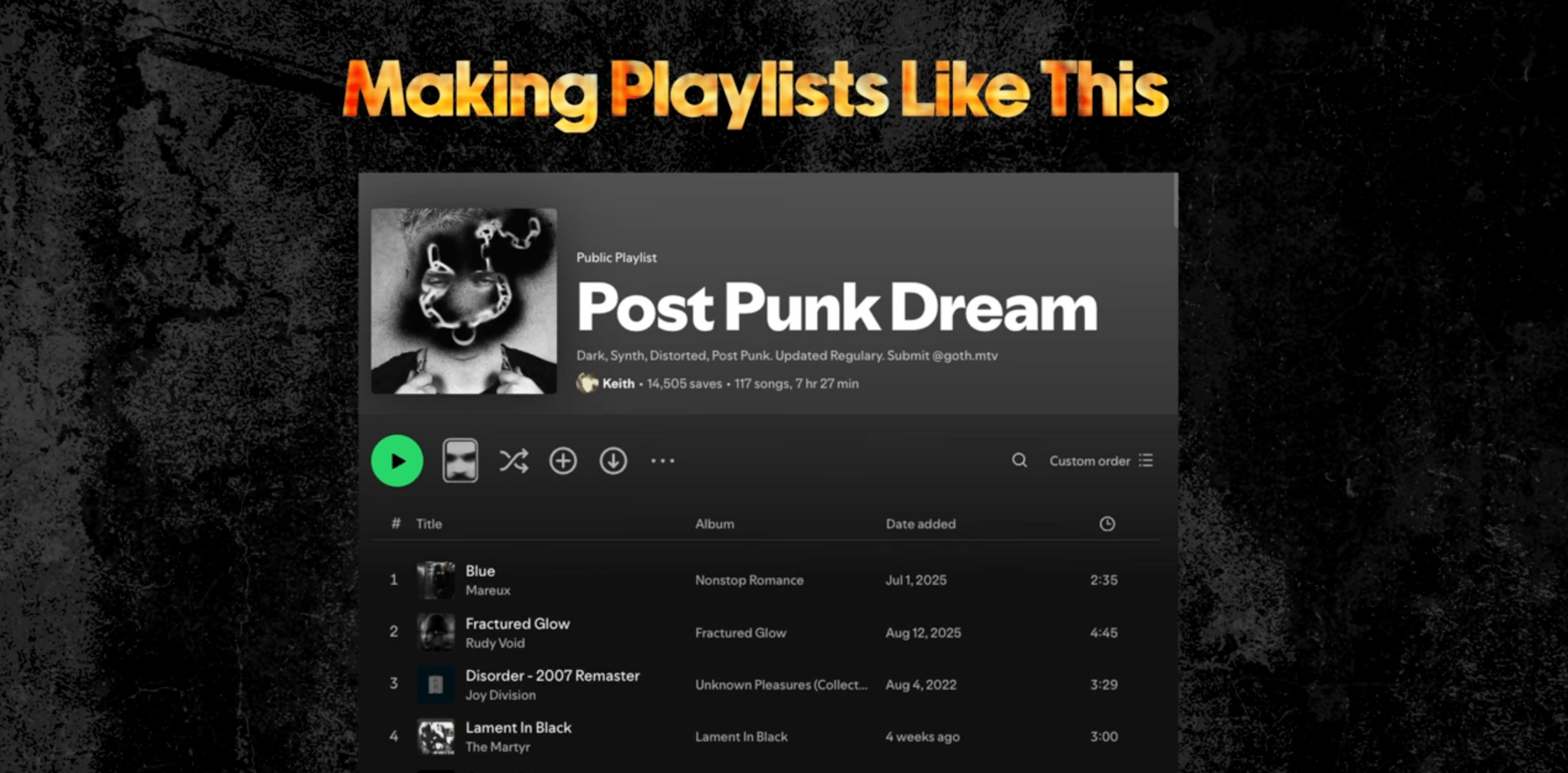These musicians and their teams don't know their microgenres, sometimes don't even know what a microgenre means, and can't find other artists who sound like them. I normally mock people for this, but I actually have empathy for the struggle. When you don't make easily identifiable music or your work fits into a broad genre, finding other people doing similar work is hard.