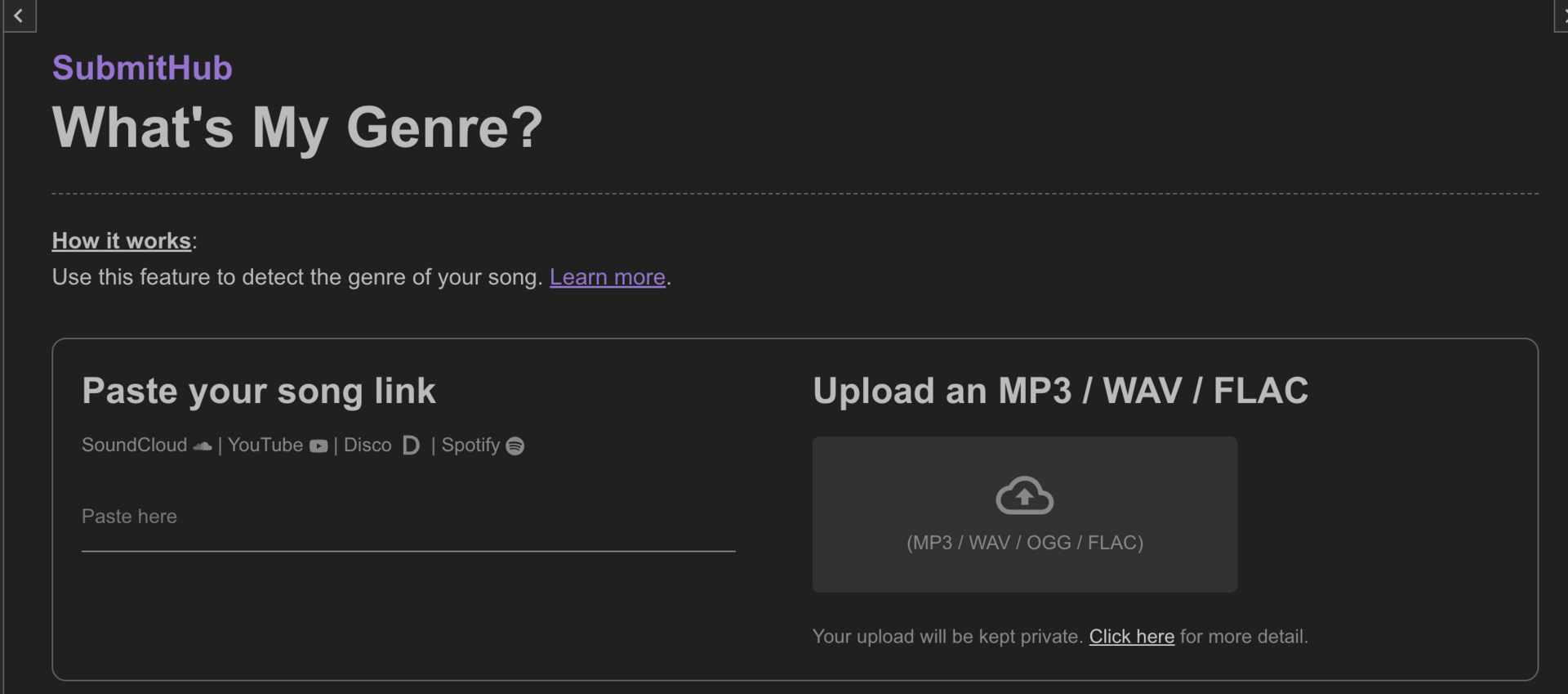 While it's not my favorite place, one of the places you can merge AI with nerds is to go to SubmitHub's genre detector tool. This will search through Discogs, which is like one of the biggest music nerd hangouts, and check the genres they use and use AI to detect them.