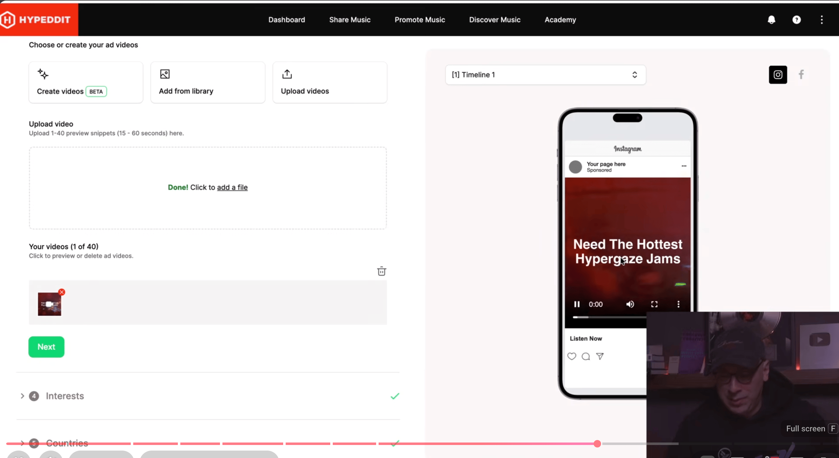 Then comes the creative piece, which is where it gets interesting. Hypeddit has a built-in video generator — currently in beta and free to use — where you upload up to three audio snippets (50 to 60 seconds each, MP3 or WAV), and it creates ad video content for you. No editing required. If you have your own video assets, you can upload those directly instead. Just note that it only accepts MP4.