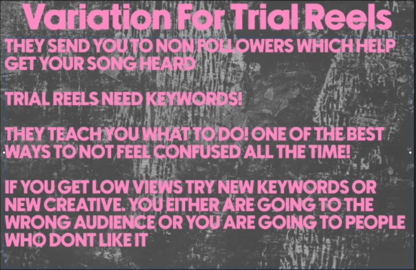 One thing that trips people up: trial reels need keywords. If you're not using them on screen or in the description, Instagram has no idea who to send you to. Keywords are how you tell the algorithm which audience to test you on, so don't skip them.