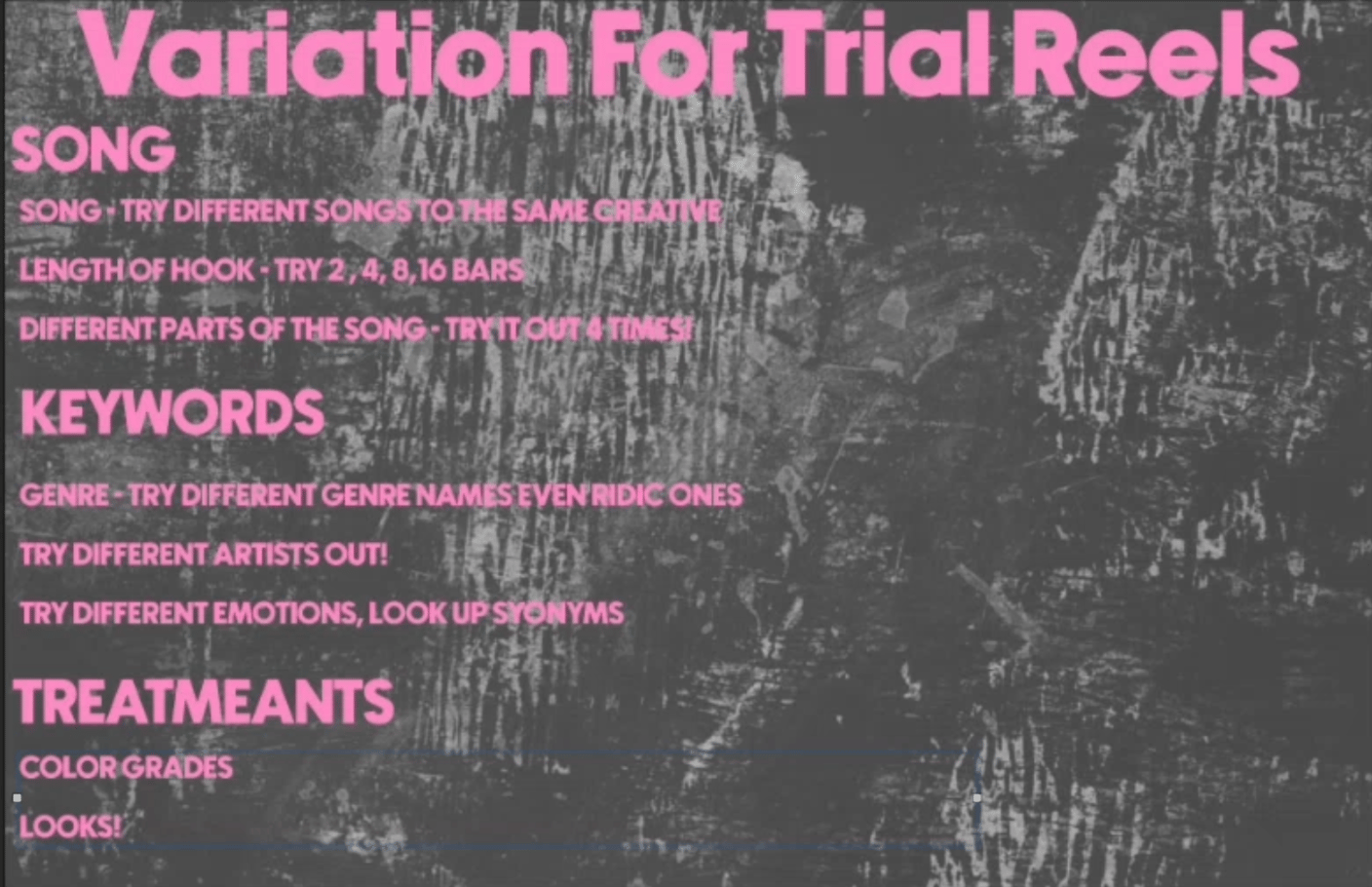 The most obvious thing to test is the song itself. Put the same creative against different tracks and see what moves. Once you've landed on a song, test the length of the hook — try 2, 4, 8, and 16 bars and see which cuts through. If you're not sure which section of the song to use, trial reels are the exact right tool for figuring that out. Run each version at least four times before concluding — results from a single run aren't clean enough to act on. (For more on song testing methodology, watch my video here .)
